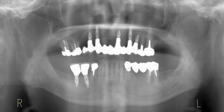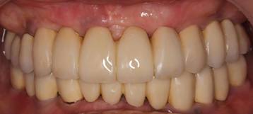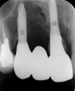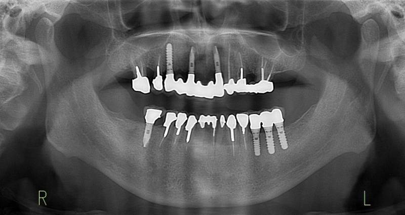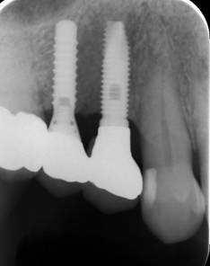 ところがインプラントとインプラントが噛みあっている場合、上部構造(インプラントに被せた冠)がすり減ると上下が当たらなくなってしまいます (天然歯同士の咬み合せがある場合、咬み合わせの高さが天然歯で維持されるため)。これに対処するには、インプラントの上部構造に、フルジルコニアなどのすり減らない材料を使う、すり減った分盛り上げることのできる材料を使う、取り外しができるようにして、やりかえるといった方法をとるなどの対策が必要になります。これはインプラントの欠点の一つです。
